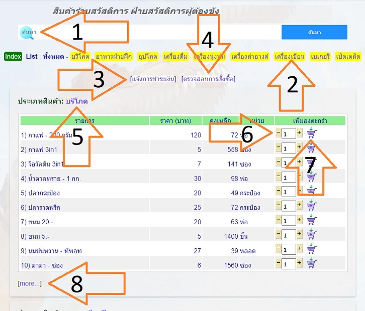 เลือกโดยการกดรูปตะกร้าเล็กๆ ที่แสดงด้านขวาของแต่ละรายการ ท่านสามารถระบุจำนวนซื้อก่อนที่จะเลือกได้โดยการกดปุ่ม (+) หรือ (-) หรือกดตรงตัวเลขเพื่อป้อนจำนวนที่ต้องการลงไปได้ก่อนกดรูปตะกร้า