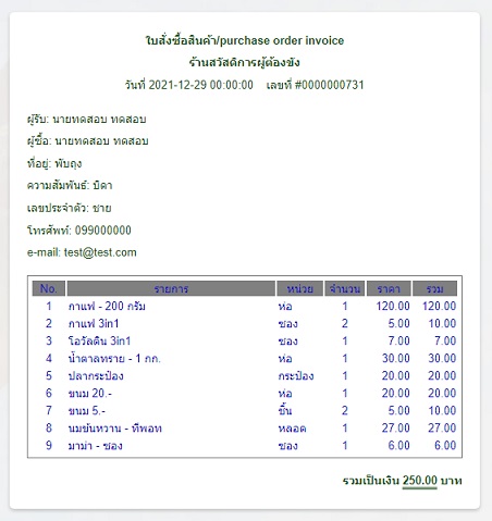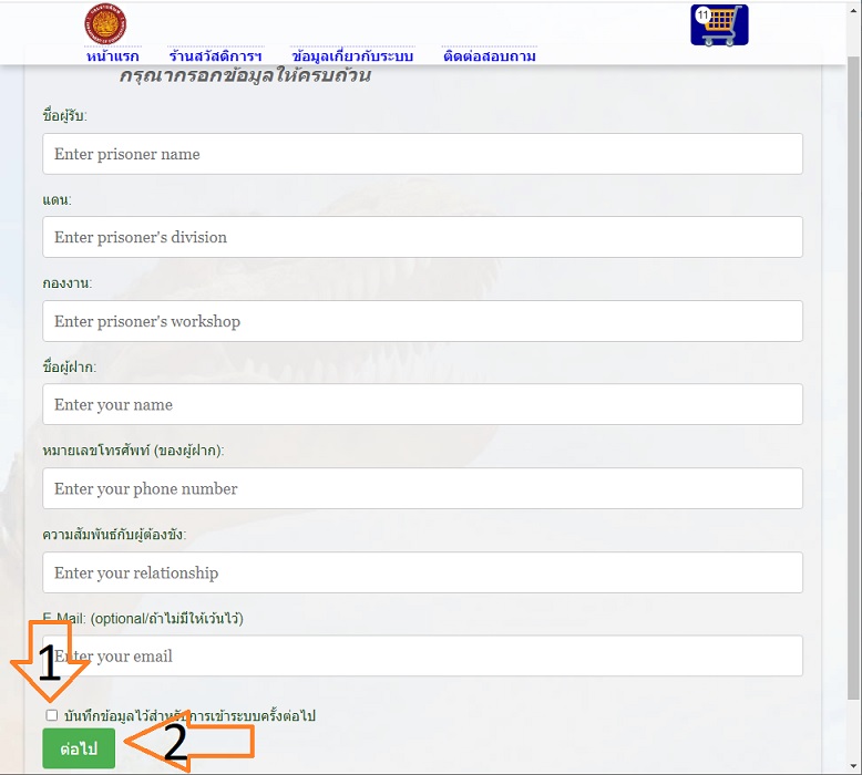 หลังจากได้รายการสินค้าตามที่ต้องการแล้ว ให้กดปุ่มชำระค่าสินค้า แสดงไว้บริเวณด้านล่างของตารางรายการ ระบบจะแสดงหน้าจอแบบฟอร์มให้กรอกรายละเอียด จากนั้นให้กดปุ่ม [ต่อไป]