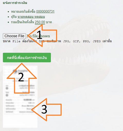 ให้ท่านกด Choose File เพื่อเลือก File Slip การโอน ถ้าหากท่านโอนด้วยโปรแกรมของธนาคาร สามารถกดเลือกได้จาก Photo Gallery หรือหากท่านโอนโดยใช้ ATM หรือโอนผ่านเค้าเตอร์ของธนาคาร ให้กดที่รูปกล้อง เพื่อถ่ายรูป slip จากนั้นให้ดกดปุ่ม [แจ้งการชำระเงิน] ระบบจะดำเนินการบันทึกและรอให้เจ้าน้าที่ตรวจสอบในขั้นตอนต่อไป